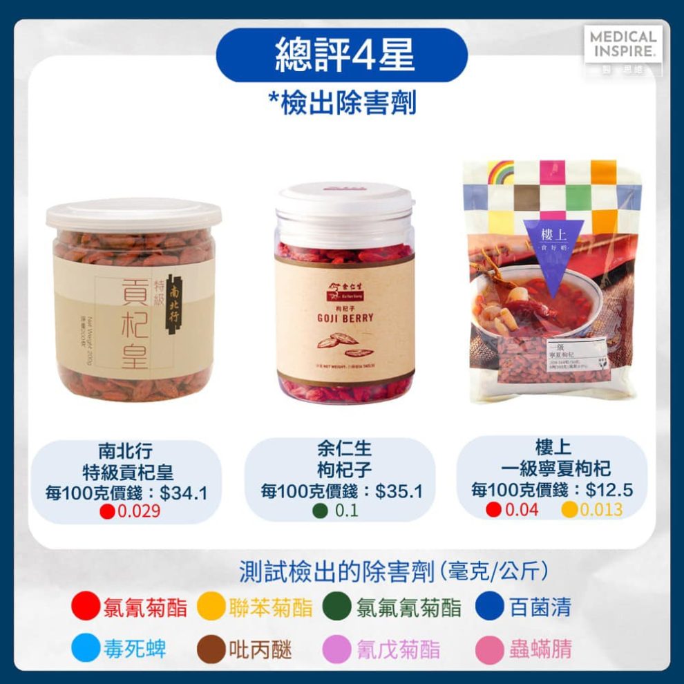 經消委會測試,結果發現全部樣本檢出不同種類的重金屬,逾七成樣本檢出殘餘除害劑。不少農民種植枸杞會灑上除害劑以減少蟲害,消委會建議消費者在進食枸杞子前,應先用水進行清洗,並浸泡15至20分鐘,以除去食物表面殘餘的有害物質(除害劑、重金屬等),降低健康風險。經測試後,有15款總評獲4星或以上的乾枸杞子推薦: